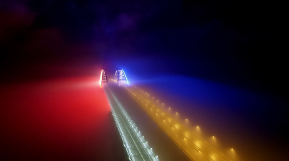 Симферополь, 15 декабря. Крыминформ. Архитектурную подсветку Крымского моста протестировали во время сильного тумана в Керченском проливе. Уникальное видео, снятое с квадрокоптера, Крыминформу предоставили в информационном центре «Крымский мост».