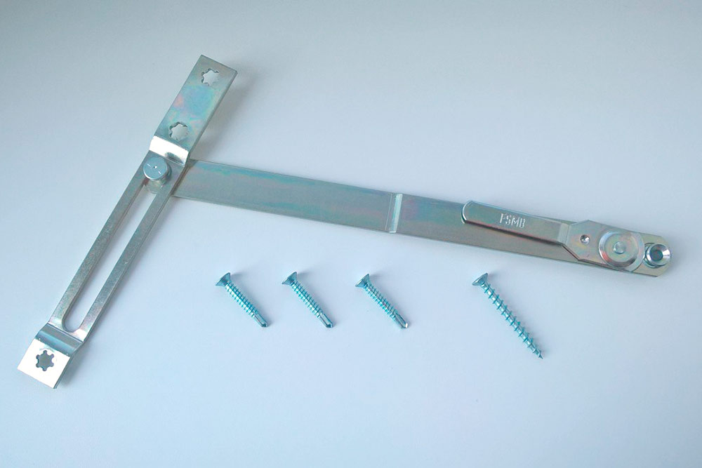 Левая планка крепится к раме, а правая — к створке окна. Когда окно закрыто, планки образуют одну линию: правая планка скользит в пазе левой. Небольшой рычажок с буквами FSMB нужен для разблокировки — чтобы распахнуть окно, поверните его.