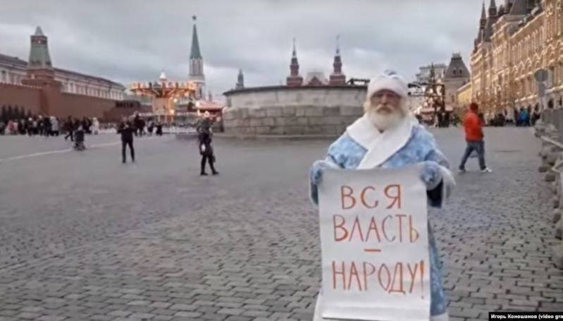 Полиция задержала в Москве журналиста и писателя из Тюмени Виктора Егорова из отряда якутского «шамана» Александра Габышева через несколько минут после того, как он вышел на Красную площадь в костюме Деда Мороза с плакатом «Вся власть — народу!».