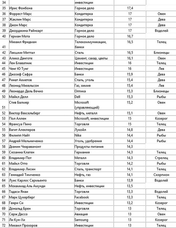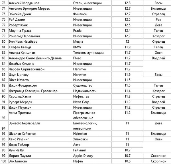 В приведенной ниже таблице журнала «Форбс» заметно, какой знак наиболее успешен. Это те самые 100 человек, о которых часто пишут СМИ, их обсуждают на ТВ-шоу…