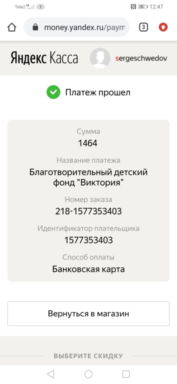И, я их перечислил в благотворительный детский фонд «Виктория». Я выбрал его, потому что смог оценить эффективность работы данного фонда. 1 464 рубля, это очень мало, но эта сумма присоединится к вкладам других людей.