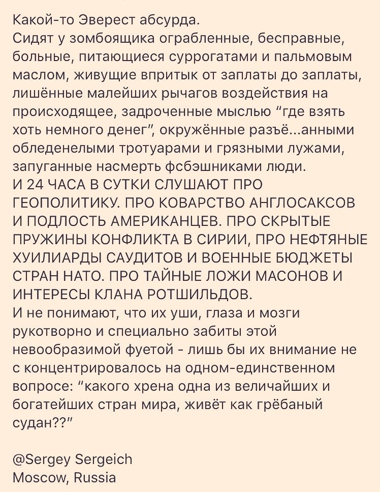 Жанна, а вы реально этого не видите? При СССР тайга не горела (чтоб прикрыть вывоз леса в китай), да и китай за амур не ходил, а щас ведут себя как хозяева и это еще цветочки, налоги только с нищиго народа дерут с олигархов же нет, ресурсы давно уже не народные да и вся стране уже не принадлежит россиянам, бензин дорожает, газ, жкх, а зп на том же уровне. Вам продолжить? Коррупция зашкаливает, полиции боишься больше чем зеков (они хоть по понятиям живут), трудовой кодекс сплошь нарушается повсеместно. Еще перечислять? Знаете у меня нет на перечисление всех "заслуг" перед народом Пу и его кодлы, я пашу по 16 часов (а оплачивают только 12) про развал производства, больницы, образование я вообще молчу. А демагогия у вас и вашего идола Пу.