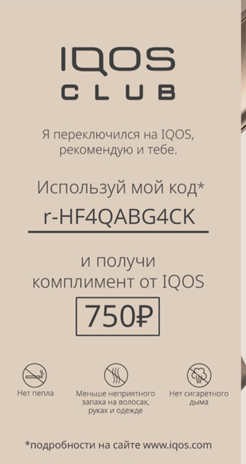 Если кому то стало интересно и плявилось желание, на фото есть код, при покупке Айкос (IQOS), экономия 750 рублей
