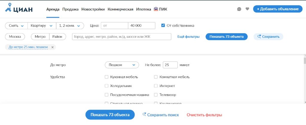 На сайте Циан нужно ввести приблизительно следующие параметры. Важна галочка "от собственника", до метро в Москве не более 25 минут пешком, 1-2 комнаты.