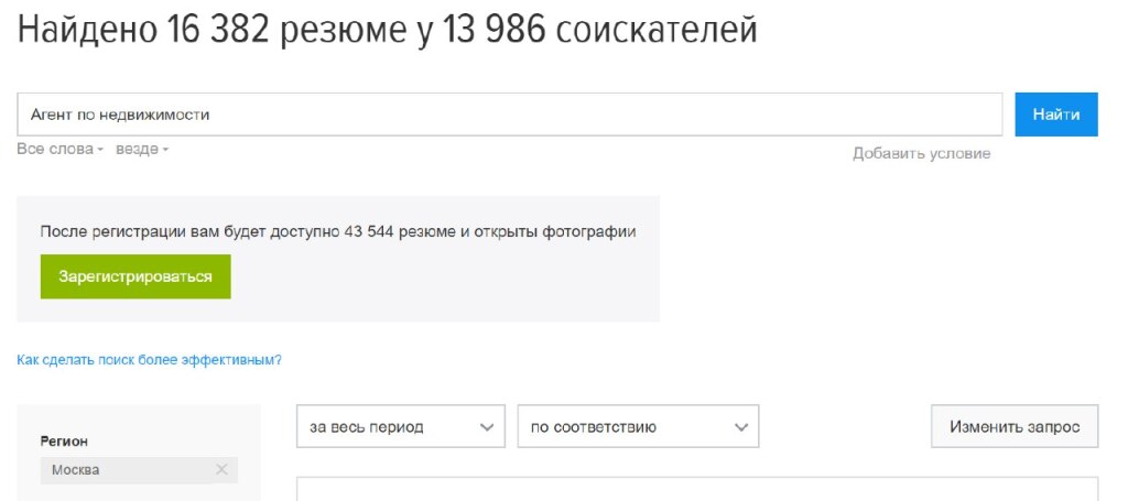 Как вы видите, в МСК 16.373 агента по недвижимости ищут работу. Думаю, они не станут противится вашему предложению. Открываете любое резюме, смотрите контакты и предлагаете ваши условия работы. То же самое с сайтом avito.ru.
