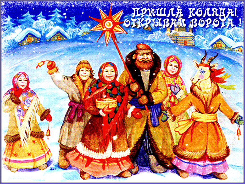 Взрослые и дети переодеваются в Деда Мороза, Снегурочку, бабу Ягу и других сказочных персонажей и с песнями славящих Спасителя и Рождество или просто Новогодними, зимними песнями идут по улице.