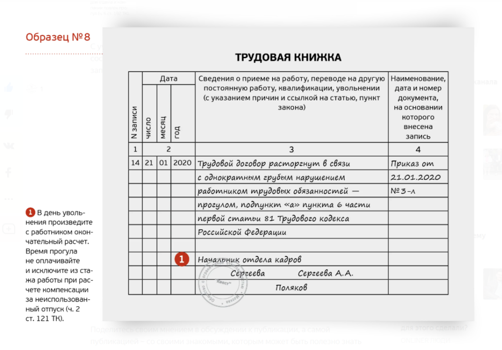 С учетом того, что действия Ивана квалифицировали как прогул, кадровик составила корректирующий табель учета рабочего времени и внесла запись в трудовую книжку.