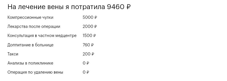 Дело было в августе 2018 года. В частной клинике за консультацию врача и УЗИ вен обеих ног она заплатила 1500 рублей. Там же узнала стоимость операции по удалению вены — еще 50 тысяч. Но денег ей стало жалко, да и нет таких денег с нашей зарплатой и она решилась сделала операцию по ОМС.