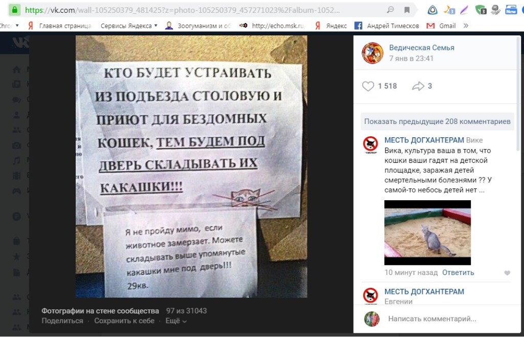 Люблю животных, но всему есть предел. Когда в подъезде без противогаза находиться не возможно, то от этого мало хорошего. Понимаю как любителей животных, так и тех кто против. Надо искать золотую середину. Но чаще всего к компромису не приходят.