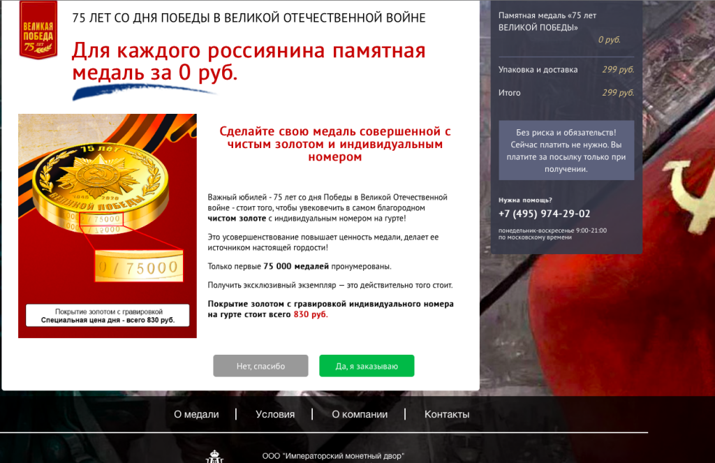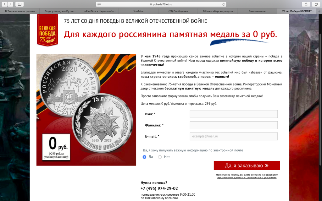 Совершенно случайно наткнулась в Интернете вот на такое извещение о том, что для каждого россиянина - памятная медаль за 0 руб. Плюсом только 299 руб. за упаковку и доставку.https://medal-pobeda75let.ru/?imdcampaign_id=11524903&imdcampaign_name=1-sh_Pobeda_BM&website=medal-