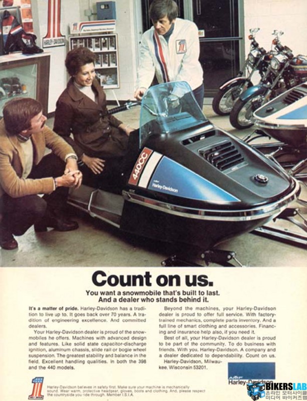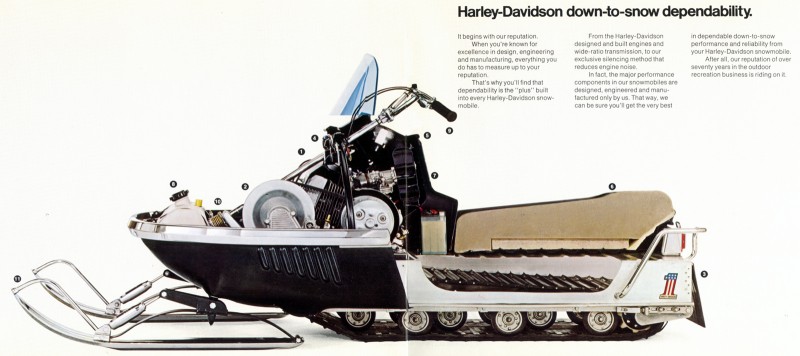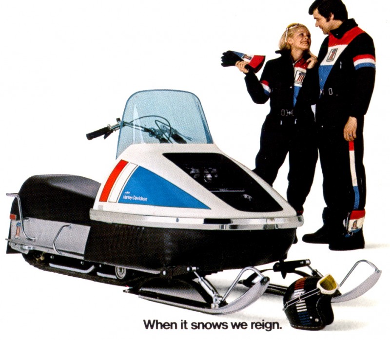 Реализацией новых снегоходов занимались как дилеры Harley-Davidson, так и бывшие дилеры Ski-Daddler. Интересно, что компания Harley-Davidson позиционировала свою линейку снегоходов в качестве отдельного, сугубо американского продукта с «собственным двухтактным двигателем Харли». Конечно, это утверждение было далеко от истины. «Снежики» H-D собирались компанией Oak Creek в штате Миссури, на чьих производственных мощностях ранее была организована сборка гольф-каров Harley-Davidson (да, да, были и такие). Но самое интересное, что «исключительно американский» снегоход комплектовался двухтактными моторами Aermacchi. Если помните, то еще в 1960 году компания Harley-Davidson приобрела 50% акций мотоподразделения компании Aermacchi, после чего успешно использовала итальянский двухтактный двигатель на популярной модели Sprint и ее внедорожных модификациях.