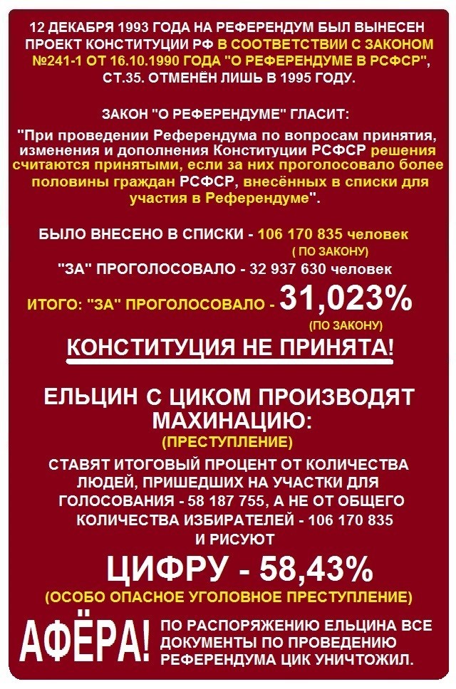 Объясняйте всем знакомым и не только, что нельзя признавать референдумы ОПГ РФ -это нужно существующей власти и теми кто из-за рубежа управляет через них, для того что-бы узаконить не существующую РФ и отменить статью 15.4 в несуществующей Конституции 1993 года после чего международные законы не будут действовать в нашей стране и мы станем бесправными на 100%. Декларация Человека и другие законы, защищающие права Человека, не дают сегодня оккупационному правительству уничтожить нас окончательно, но признавая референдум мы сами себе подпишем смертный приговор, так как в РФ нет прав у Человека как и нет самого Человека. Нас сделали Физ. лицами для того что-бы можно было с нами взаимодействовать юридическим компаниям, которых создала ОПГ РФ, юр.лицо не может вступать в отношения правовые с Человеком, только с юр.лицом или физ. лицом. Это было возможно только в государстве СССР, где государственные организации могли иметь правовые отношения с гражданами..