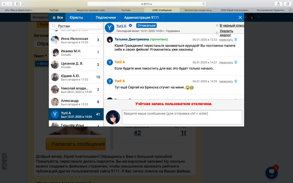 Обращаюсь к Вам, Юрий Анатольевич, с большой просьбой. Пожалуйста, перестаньте делать подлости и пакости на сайте 9111. Вы же взрослый человек! Ну, сколько можно создавать фейковые странички, чтобы умышленно занижать рейтинги публикаций других пользователей сайта. Я Вас лично ловила неоднократно на Ваших фейках.