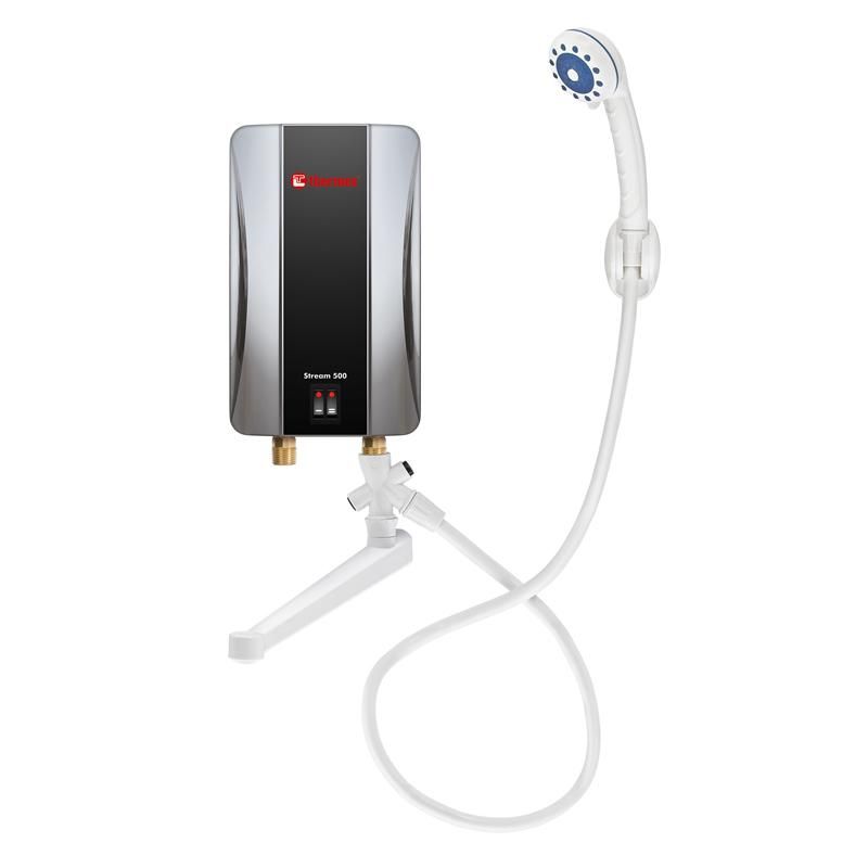 Вода поступает в корпус, проходит через нагревательный элемент и сразу попадает в смеситель. Регулировка температуры происходит на корпусе устройства.