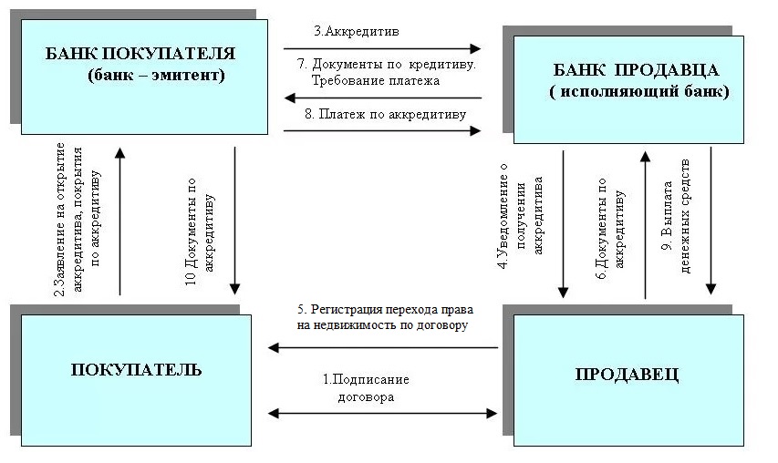 Аккредитив – безналичная операция, по которой банк по заявлению покупателя обязуется осуществить платеж продавцу. Покупатель недвижимости предлагает банку принять на себя обязательство перед продавцом по оплате стоимости недвижимого имущества продавца.