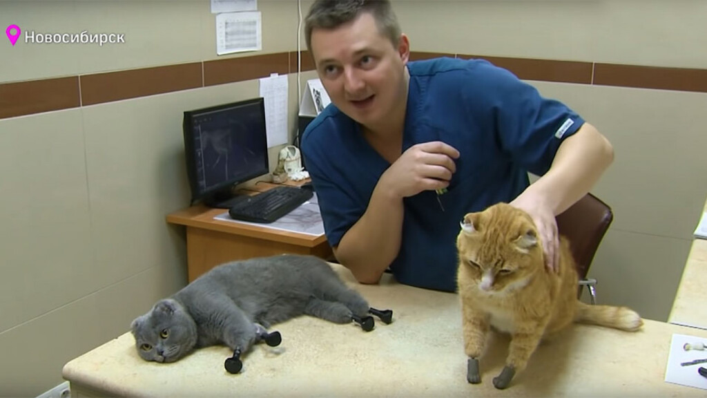На фото. Ветеринар Сергей Горшков с дымкой и рыжиком, двумя кошками с четырьмя бионическими лапами, которых он лечил. Скриншот Youtube / TV 360