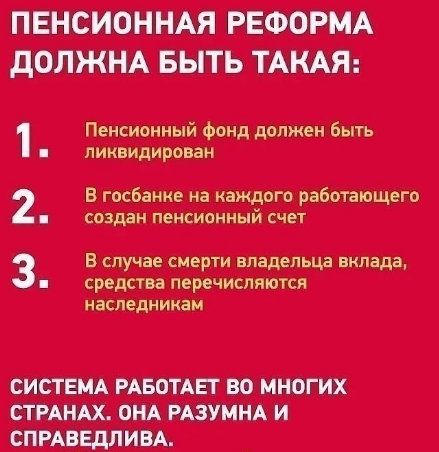 Также партия настаивает на упразднении Пенсионного фонда Российской Федерации, существенном расширении периодов, включаемых в страховой пенсионный стаж периодами ухода за ребенком до 3 лет, получением высшего образования, в партии требуют отмены заморозки пенсионных накоплений, а также настаивают на полноценной индексации и пересчете размера пенсий за период с 2015 до 2020 года в отношении работающих и неработающих пенсионеров.