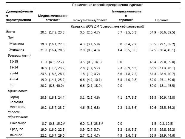 Из приведенной таблицы следует, что самым распространенным методом прекращения курения, который использовался в предыдущие 12 месяцев, стало медикаментозное лечение (20,1%). За советом или консультацией обращались всего 3,5% опрошенных, и 3,7% применяли немедикаментозную терапию. Несмотря на то что у категории "Прочее" показатель весьма высок (34,9%), более 20% курильщиков, т.е. большинство, ответили, что пытались бросить курить собственными силами, иными словами, не пользовались никакими специальными способами прекращения курения. Небольшое число курильщиков (4,7%) заявили, что, пытаясь бросить курить, использовали орехи, семечки и конфеты.