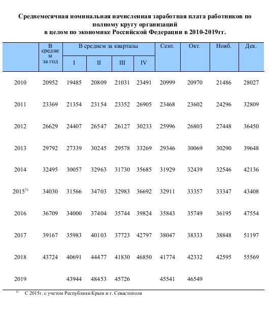 На момент написания статьи отсутствуют сведения в целом за 2019 год, а также за 4 квартал и за ноябрь-декабрь месяц. За ориентир возьмем октябрь 2019 года. Среднемесячная номинальная начисленная заработная плата за этот месяц в целом по всем организациям страны – 46 549 рублей.