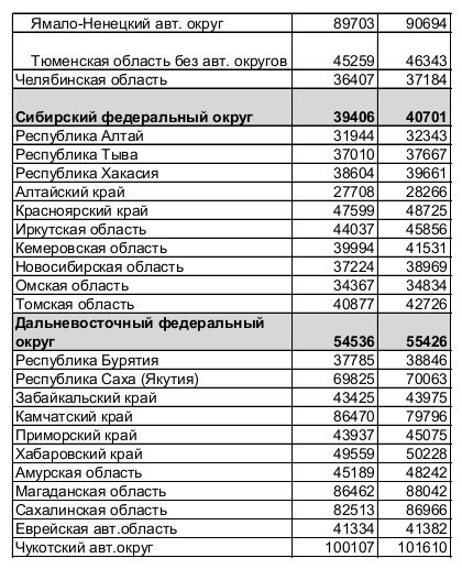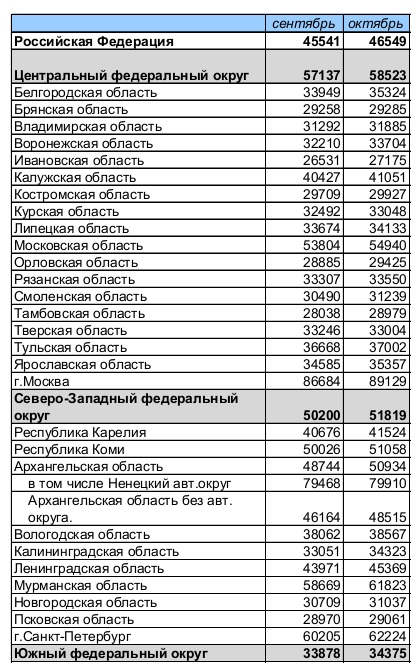В связи с этим остается ориентироваться на данные Росстата. Ниже прилагаются сведения о среднемесячной номинальной начисленной заработной плате работников по полному кругу организаций по субъектам Российской Федерации за сентябрь-октябрь 2019 года (данные по состоянию на 20 декабря 2019 года).