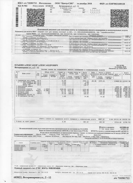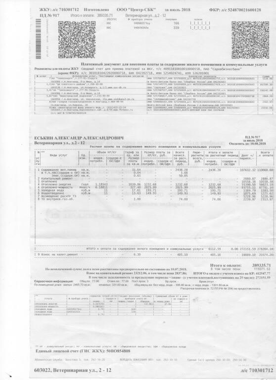 В прилагаемой к иску истории начислений по услуге отопление по л/с 710301712 ошибочно произведены расчёты по строке «отопление-энергия» столбец «кол-во» без учёта общей площади нежилых помещений МКД №2 по ул. Ветеринарная в размере 331,6 м 2: 77 м 2 х 37,96 Гкал /2465,7 м 2 = 1,18543 Гкал (данный неправильно рассчитанный объём потребления тепловой энергии указан в строке 4 прилагаемых к статье платёжных документов ООО «Центр-СБК» (Приложение к статье) с округлением 1,19 Гкал повторен по строке «отопление-энергия» столбец «кол-во» в квитанциях.