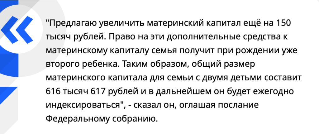Все мы уже слышали и знаем о поручении В.В.Путина, который предложил увеличить материнский капитал ещё на 150 тысяч рублей. Право на эти дополнительные средства к материнскому капиталу семья получит при рождении уже второго ребенка. Таким образом, общий размер материнского капитала для семьи с двумя детьми составит 616 тысяч 617 рублей.