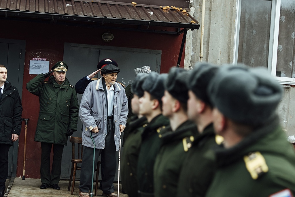 В свои неполные 97 он не собирается с окна смотреть в глаза тем, кто к нему пришел, а спеша накидывает куртку и выходит на улицу