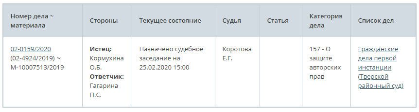 Ольга Кормухина подала Иск в Тверской районный суд города Москвы на свою коллегу Полину Гагарину, обвиняя ее в нарушении авторских прав