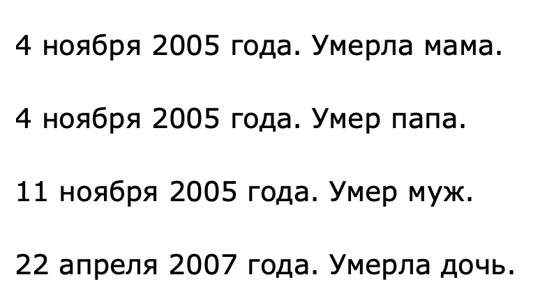 Напомню хронологию кошмара. Наталья жила с родителями, мужем и ребенком в сталинской высотке на Котельнической набережной, в элитном корпусе «В» (буква означала принадлежность к высшей партийной школе). Ее отец — Леонид Герасимов — был большим начальником в Министерстве нефтяной и газовой промышленности СССР, мать — главным врачом-педиатром гражданской авиации. Сама Наталья военный хирург, работала во врачебной комиссии ФСБ. Беды начались, когда женщина уволилась из органов, а семья решила продать квартиру. В один день умерли родители, через неделю — муж, еще чуть позже при странных обстоятельствах погиб ребенок. У самой Натальи пропали все документы (кто-то уничтожил даже семейный архив с фотографиями, словно хотел стереть саму память о Ферапонтовых-Герасимовых). И когда она пошла восстанавливать паспорт, выяснила, что числится мертвой: есть справка о смерти и даже свидетельство о вскрытии, которое показало, что причина смерти — сердечный приступ. Мистика и чудовищная реальность переплелись в ее судьбе так, что не разберешь, не поймешь и не поверишь.
