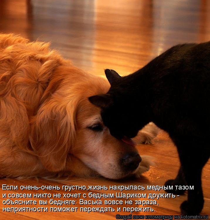 У меня кот и собака так обожают друг друга, что ходят во дворе только вместе. Неразлучные друзья! Спят вместе, хотя у каждого - своё место. Я делаю видеоролики о моих любимцах и рассылаю друзьям. Моменты бывают чудесные! Друзья просят каждый раз ещё и ещё
