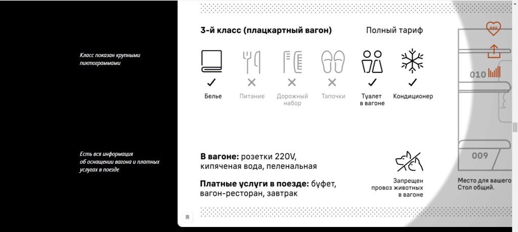 В нижней части билета указаны услуги, на примере плацкартного вагона