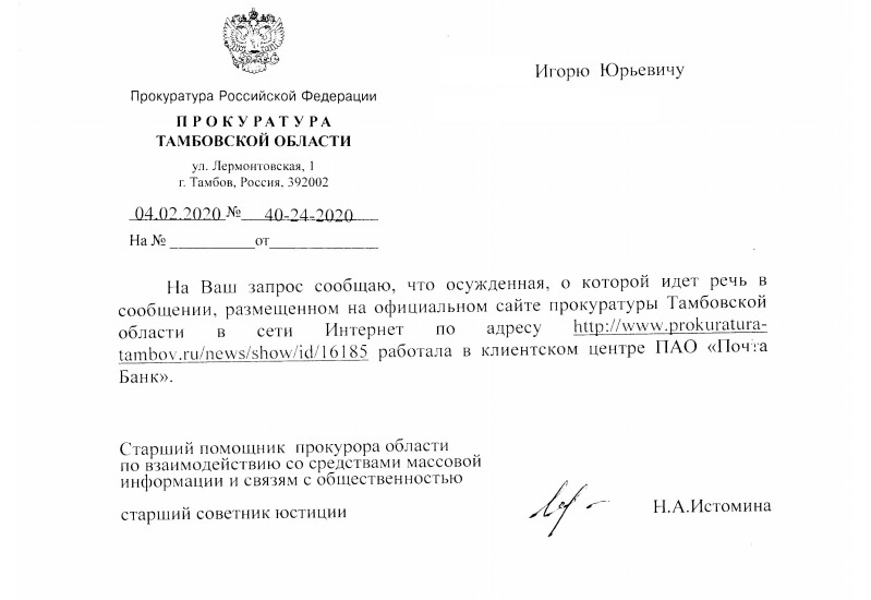 Недавно я опубликовал статью о том, как одна юная особа, работая кредитной менеджерицей, обманывала граждан при выдаче кредитов. Воруя у них ещё по нескольку тысяч.В статье областной прокуратуры, в которой рассказывалось об этом деле, не было упомянуто о том, что за банк представляла девушка. Я обратился к прокурору с просьбой озвучить, в каком банке работала менеджерица. Сегодня пришёл ответ.
