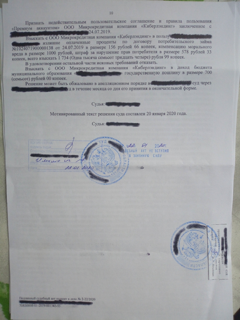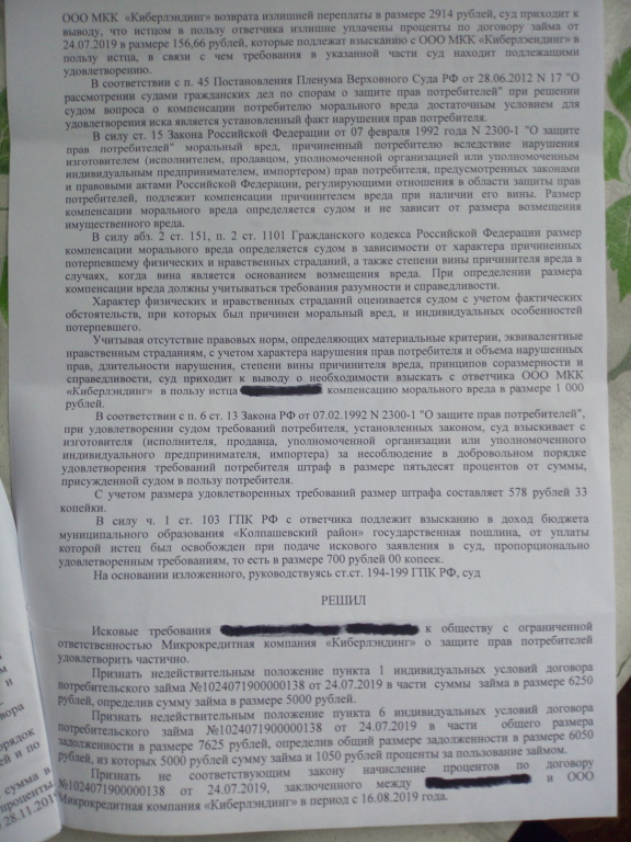 Таким образом, предоставление услуги со стороны микрокредитной организации не соответствует нормам действующего законодательства и является неправомерным, что удалось подтвердить только благодаря обращению в суд за защитой своих прав... Помимо этого клиент микрофинансовой организации, получивший возврат части денежных средств до вынесения судебного решения, получил и компенсацию морального вреда, и штраф со стороны кредитора в свою пользу за нарушения своих прав потребителей...