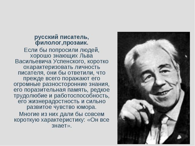 Неудивительно, что книги Успенского получили такой успех, ведь Лев Васильевич всегда умел владеть словом, и делала это с изумительным остроумием. Однажды он получил от издателей грозную телеграмму: «Немедленно шлите рукопись…», — однако телеграф переврал «рукопись» в «куропись». Тогда Успенский ответил моментально: «Курописи нет высылаю жукопись и паукопись».