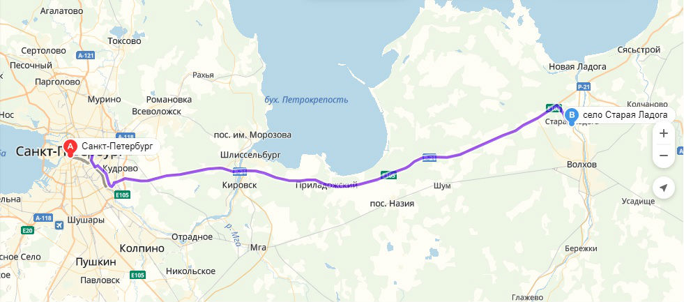 Из Санкт-Петербурга: расстояние от Санкт-Петербурга до Старой Ладоги составляет 130 километров. Путь идет в направлении на восток по трассе Р-21.