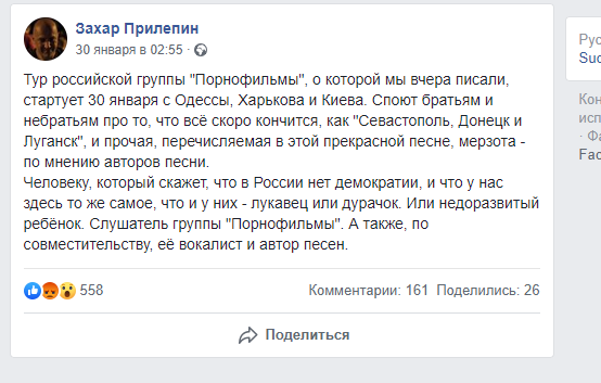 Вы читая настоящую публикацию должны иметь ввиду, что пишет её либо лукавец, либо дурак, либо недоразвитый ребёнок, но это только по мнению человека который разместил в сети пост в Facebook**** от имени Захара Прилепина. Размещал ли свой пост сам Прилепин или нет, никто не знает - ведь если подать на него заявление о преступлении, уверен, что он будет отказываться от своих слов, или СК РФ скорее всего его просто будет освобождать от уголовной ответственности - не допустят МОВЕТОН.