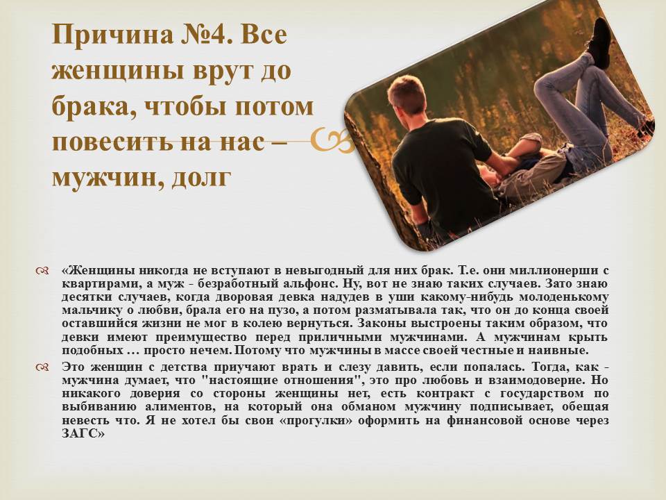 Проанализировав большое количество форумов, поняла, что в большинстве своём, сильная половина общества вообще предпочитают не вступать в брак.