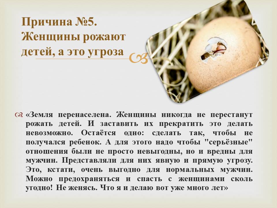 Какой-то нехороший вывод напросился сам собой: мужчины не хотят детей, бояться женщин и считают, что все - они, для них зло.