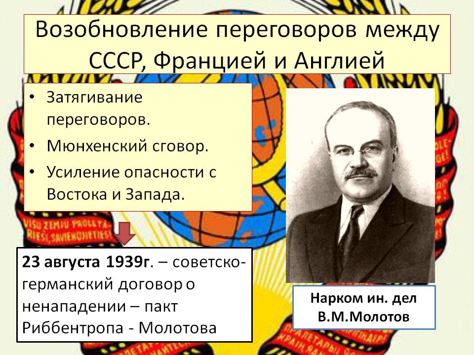 Со стороны Англии и Франции это была ответная реакция на Мюнхенское соглашение, чтобы успокоить общественное мнение своих стран. Следует сказать, что переговоры были заранее обречены на провал, так как руководство указанных стран по большому счету изначально не хотело заключать с СССР никаких договоров, направленных против фашистской Германии, которая являлась частью западной (атлантической) цивилизации. При этом они сами ее взрастили и пытались направить на Восток, то есть на СССР.