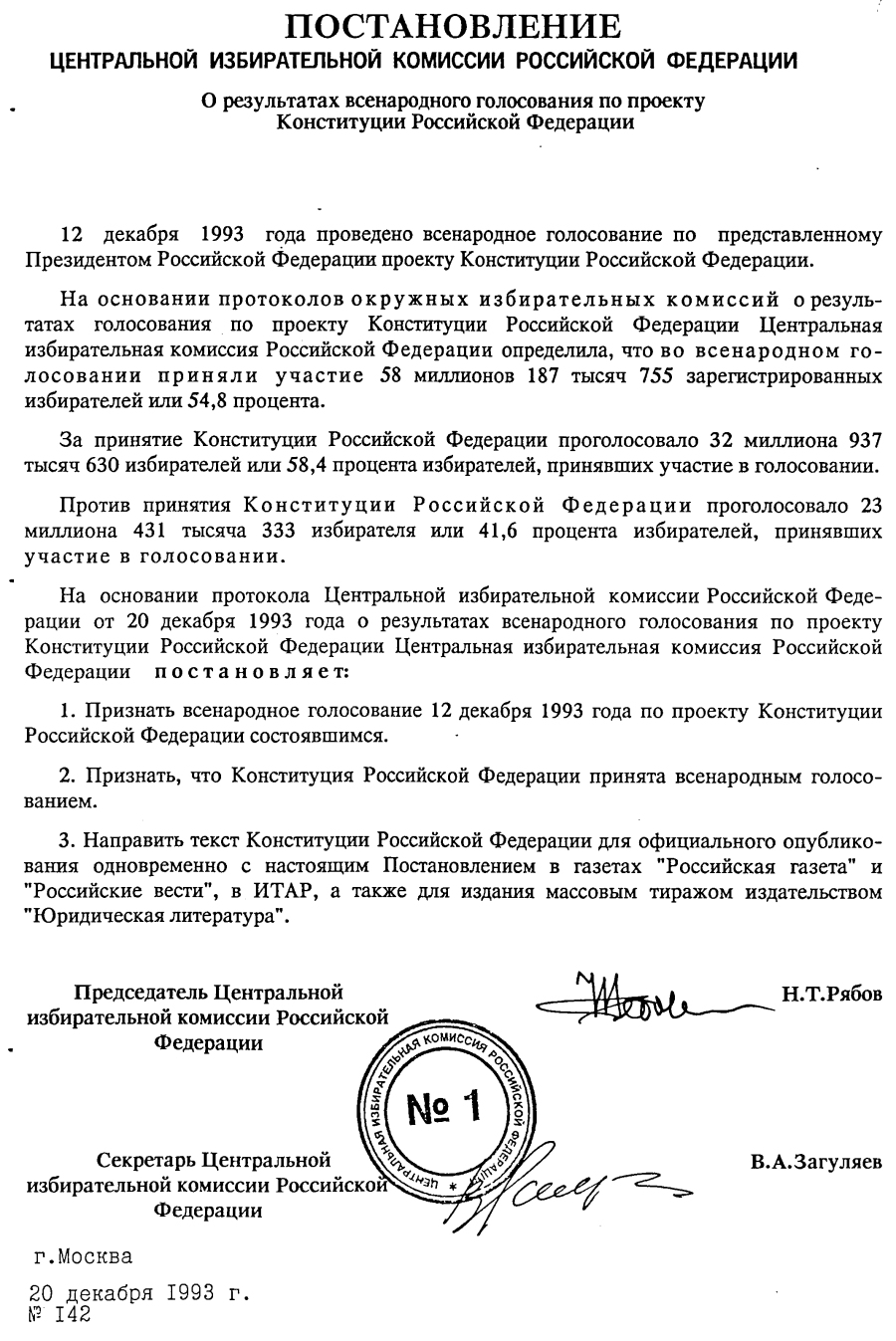 В 1993-м году Конституция РФ не была принята, от слова "совсем". За неё проголосовало 30 с небольшим % от общего числа граждан, включённых в списки для голосования. По тогдашнему закону РСФСР, Конституция принятой считалась, если за неё проголосуют 50% + 1 голос от ОБЩЕГО ЧИСЛА ИЗБИРАТЕЛЕЙ, а не от числа принявших участие в голосовании. Ельцин вместе с ЦИК совершил подлог. Принимая "поправки", которые могли бы принять единоросы Конституционным большинством, граждане примут и Конституцию. А поскольку, Конституция не была принята, то все "власти", включая Путина и Ельцина, а так же их законы - НЕ ЛЕГИТИМНЫ!