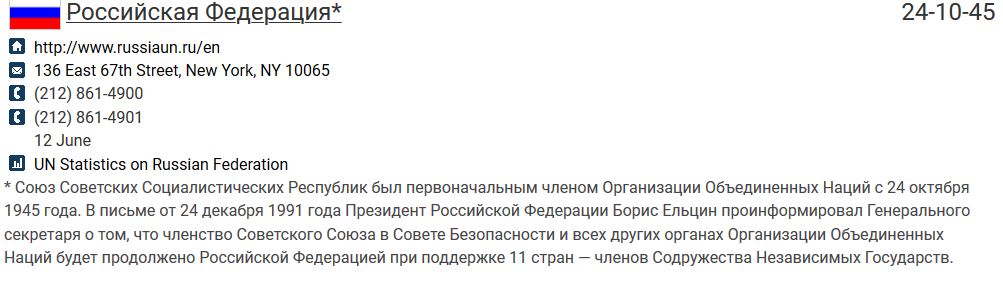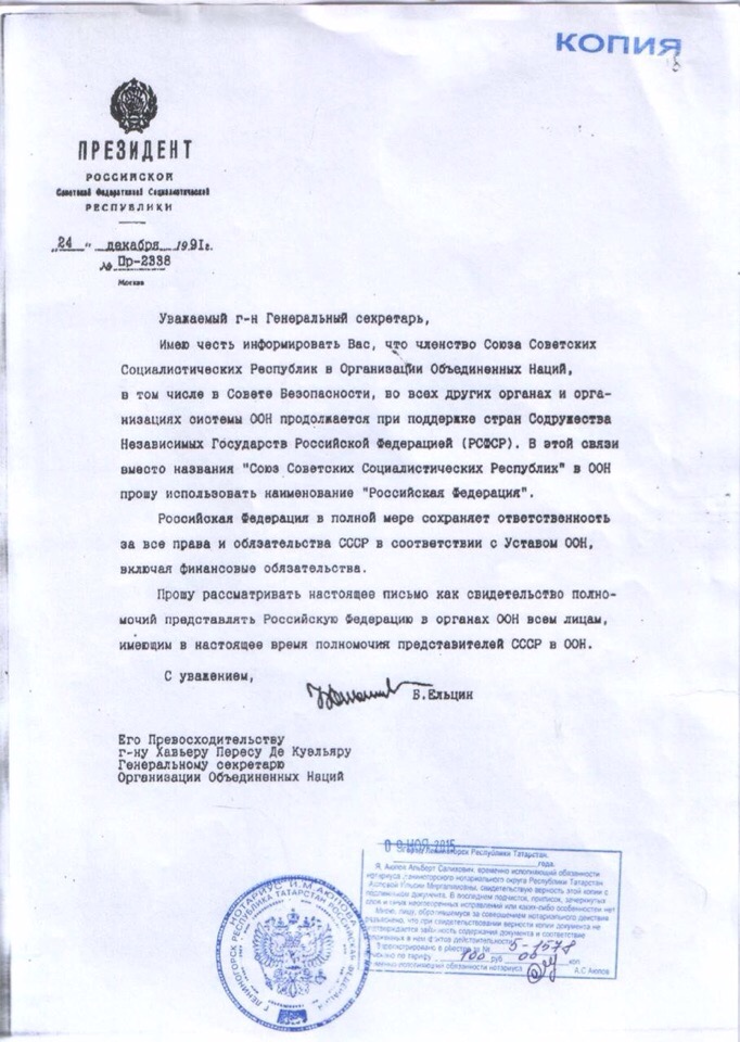 "Где уж нам уж, выйти замуж"... "Конституционное собрание", а не комиссия. Когда было созвано Конституционное Собрание"? Дату и ссылку в студию! Статья 135 не принятой "Конституции" 1993-го года. А теперь, обьяснтите мне тупому, почему в составе 5 постоянных членов Совета Безопасности ООН числится СССР, а не Российская Федерация? Ссылка: un.org . И почему РФ, по словам Путина не может получить доступ к зарубежным активам СССР? Брильянтовый Вы мой.