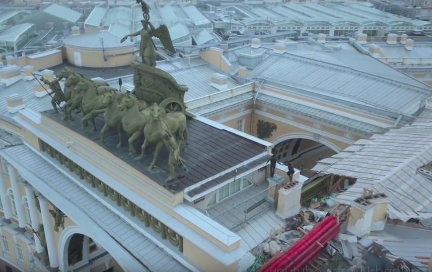 Руферы забрались на здание Главного штаба на Дворцовой площади в Санкт-Петербурге. Об этом рассказали очевидцы, прислав в редакцию видозапись.
