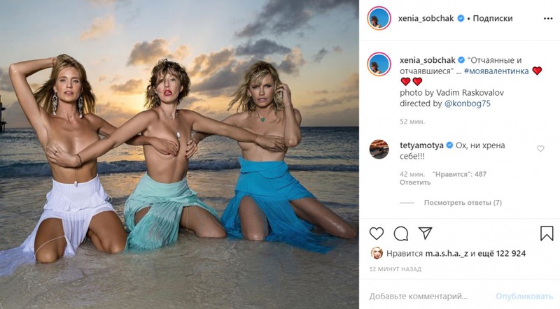 Самым обсуждаемым стало поздравление от трех подруг: Глюкозы, Ксении Собчак и Яны Расковаловой. Недавно они вместе с супругами отдыхали на Мальдивах, где и устроили провокационную фотосессию. В кадре грации позируют на белом песке на фоне заката, едва прикрывая грудь руками.
