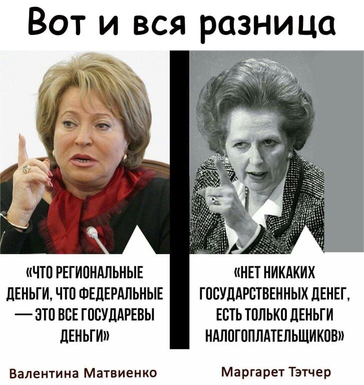 "...Что региональные деньги, что федеральные — это все государевы деньги", — заявила В.Матвиенко, которая являлась на тот момент третьим лицом в России.А вот Маргарет Тэтчер уверена на 100%, что: