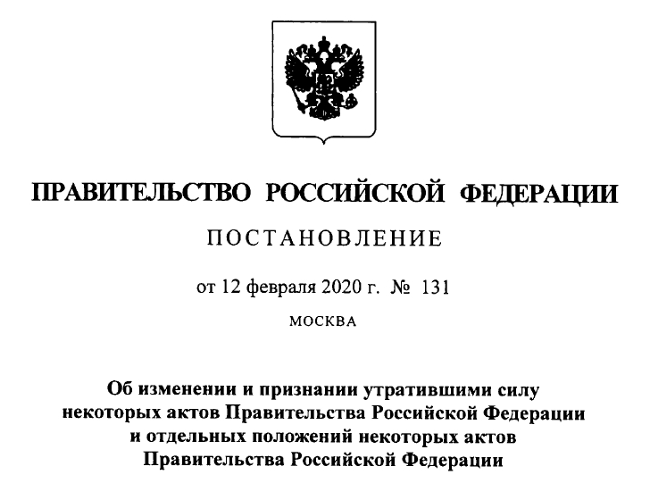 Постановление Правительства РФ от 12.02.2020 № 131 «Об изменении и признании утратившими силу некоторых актов Правительства Российской Федерации и отдельных положений некоторых актов Правительства Российской Федерации»
