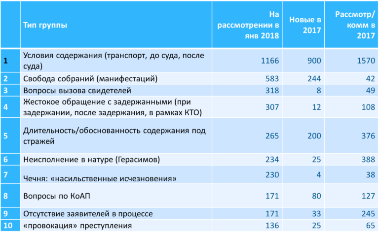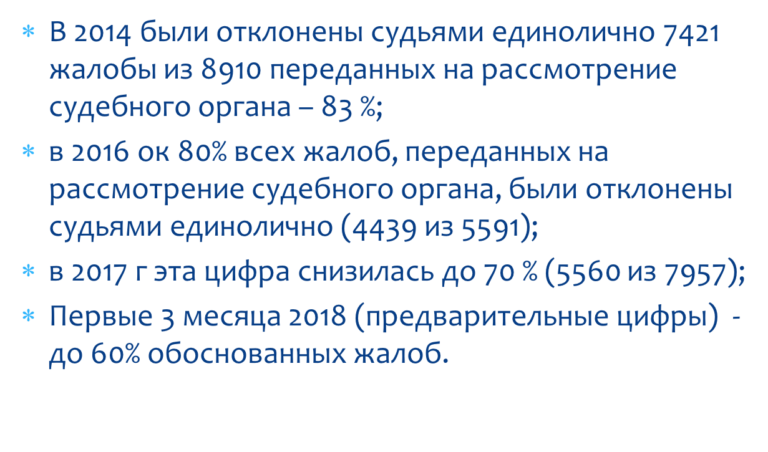 Как видим, бОльшая часть жалоб отклоняется, а преобладают жалобы на условия содержания в СИЗО и длительность содержания под стражей…
