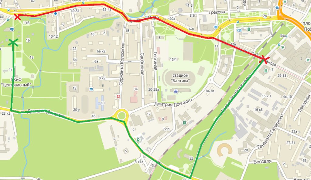 Мой маршрут, красным забег "под контролем" зелёным "обходной манёвр"