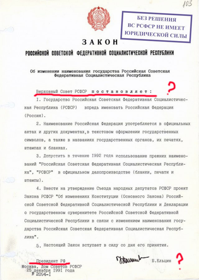 А с какого перепугу РФ стала законным государством, если появилась в результате двух госпереворотов, устроенных ельциным в 1991 и 1993 годах? И "закон" о переименовании РСФСР в РФ ельцин подписал как самозванец: РФ ещё нет, а он себя именует "президент РФ" и подписывает несуществующее решение Верховного Совета.