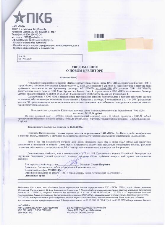 К тому же сумма, указанная ими в это уведомлении, более чем в ДВА РАЗА превосходила первоначально заявленный долг ими в судебном приказе (напомню: было 10 000 рублей) и составила за 2 месяца уже 28 225 рублей! Никакого расчёта конечно не было приложено, только указания выплатить различными способами непосредственно на счет коллекторского бюро по перечисленным реквизитам до 20.02.2020 года.