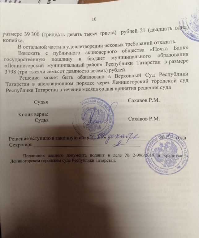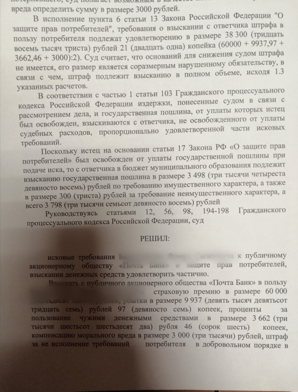 Состоялось решение суда по взысканию незаконно навязанной страховки с Почта Банк. В результате незаконных действий Почта банк по навязыванию услуги страхования с банка взысканы сумма страховой премии 60 000 рублей, 9937 рублей 97 копеек проценты по ставке банка, 3 662 рубля 46 копеек проценты за пользование чужими денежными средствами по ключевой ставке ЦБ РФ, 3000 моральный вред, штраф в пользу заемщика составил 39 300 рублей 21 копейка. Итого на выплату 115 900 рублей 64 копейки.